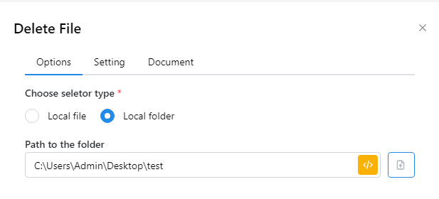 * Local folder: Enter the path of the folder you want to delete or select a variable containing a valid path.