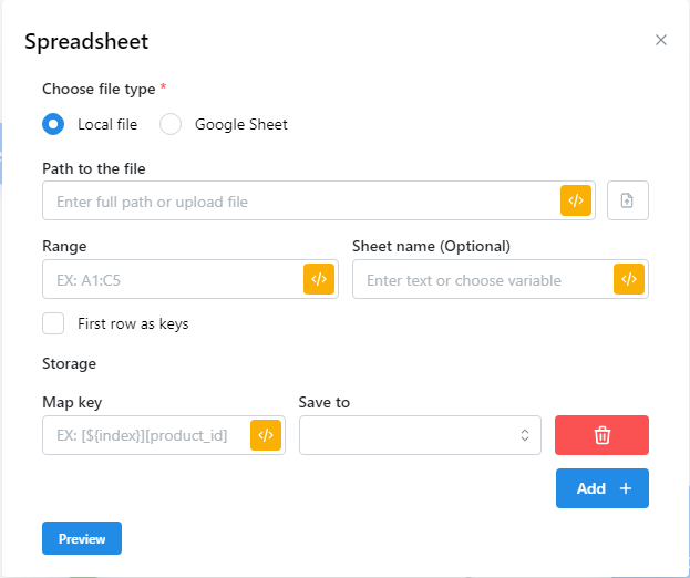 Node Spreadsheet helps you read data from excel files or google sheets.