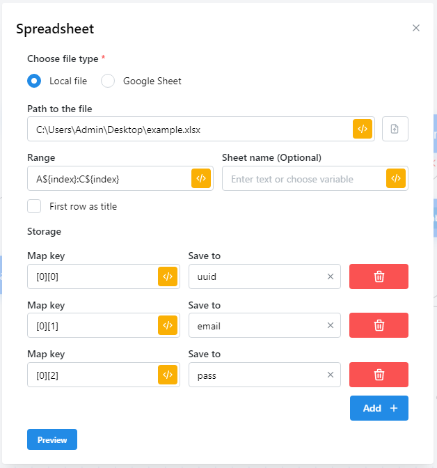 * Range: Một nhóm các ô trong file excel. Ví dụ bạn muốn đọc dữ liệu từ ô A1 đếm ô E5, ta sẽ nhập trường Range là A1:E5. Trường range này chỉ có thể nhập chữ hoa.
