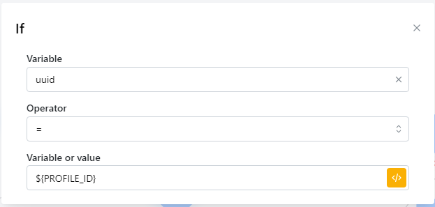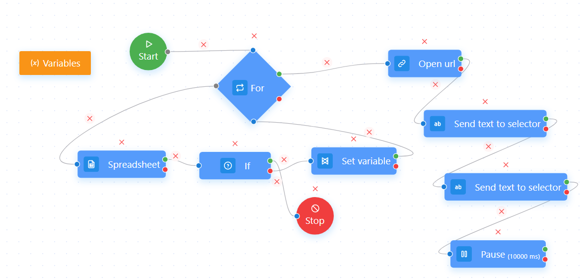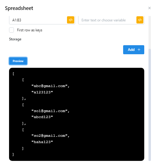 Với bảng dữ liệu như trên thì tại node for ta sẽ cho chạy 10 vòng lặp. Mỗi vòng lặp ta sẽ chạy qua từng hàng của file excel nhờ node Set variable, node làm giá trị của biến index tăng lên 1 sau mỗi vòng lặp. Khi biến này được tăng lên thì trường Range của node Spreadsheet qua mỗi vòng lặp sẽ lần lượt là A1:B1, A2:B2, A3:B3,....... Khi lặp như vậy ta sẽ sử dụng node if làm điều kiệm để so sánh Profile\_id của profile đang chạy với uuid của file excel. Nếu Profile\_id trùng với uuid của file excel thì dừng vòng lặp và ghi dữ liệu của hàng đó vào biến để sử dụng cho các node tiếp theo.