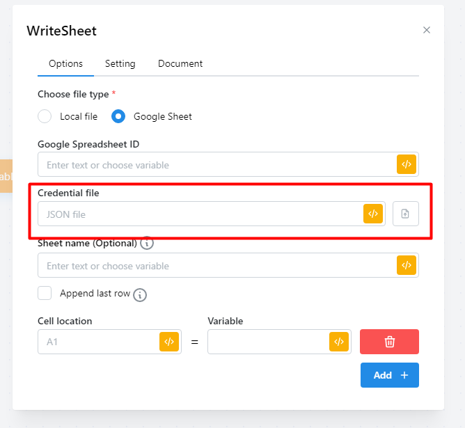 * Cell location: Nhập vị trí mà bạn muốn ghi dữ liệu. Khi bạn không chọn checkbox Append last row thì bạn phải nhập ô cần ghi dữ liệu ví dụ A1, B1, A2,..... và nếu các ô đó đang có dữ liệu thì node sẽ ghi đè dữ liệu. Còn khi bạn chọn checkbox thì bạn chỉ cần nhập tên cột là A, B, C… thì node sẽ tự hiểu vào ghi vào dòng tiếp theo của hàng cuối  cùng chứa dữ liệu.