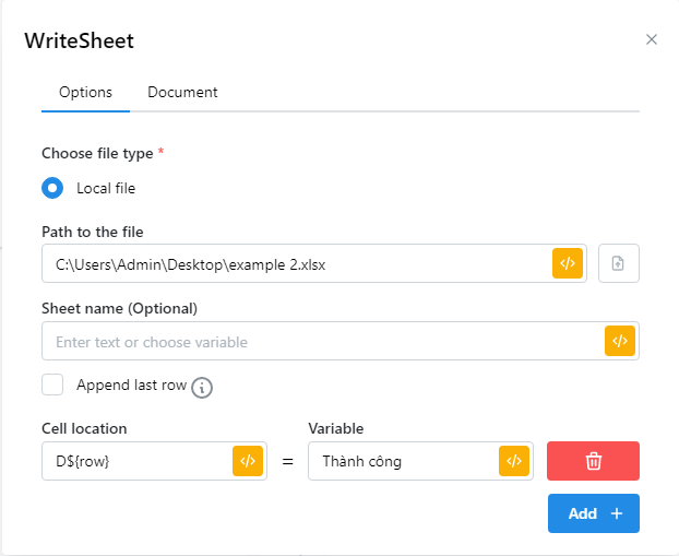 * Variable: Nhập giá trị mà bạn muốn ghi vào ô.