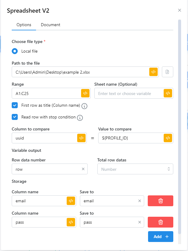 Và bạn muốn đọc từng hàng của file khớp với từng profile tương ứng theo uuid, thì node Spreadsheet V2 ta nhập như sau:&#x20;