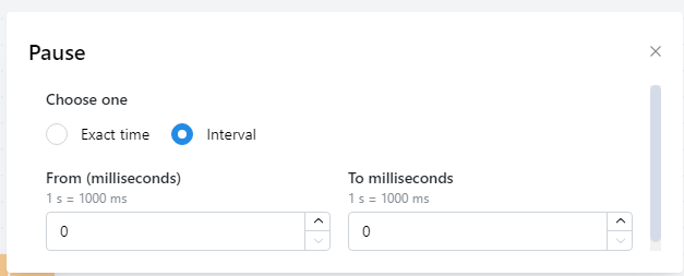 | Interval   | Random một giá trị thời gian trong khoảng **From - To**(mili giây) mà bạn nhập, Bạn phải nhập **To** lớn hơn **From** |