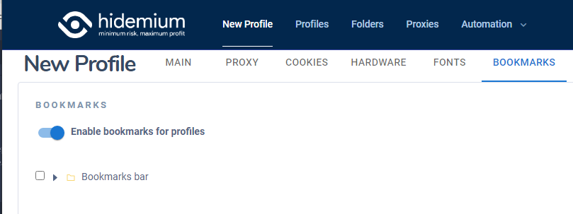 You can click “Enable bookmarks for profiles” to allow Hidemium to store web pages, images or files that you frequently visit or unfinished on your computer. When you open the browser, you just need to click on the icon of the website you need to visit on the toolbar then it immediately opens.