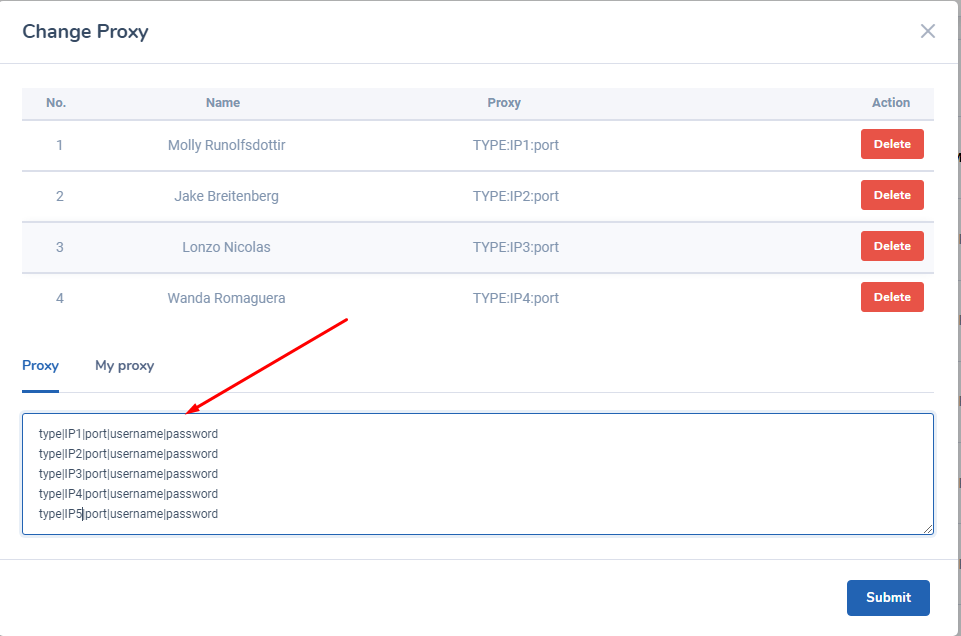 Popup change proxy hiện lên, bạn có thể nhập proxy mà bạn muốn thêm vào profiles tại đây, các type proxy là SSH, HTTP, SOCKS4, SOCKS5: