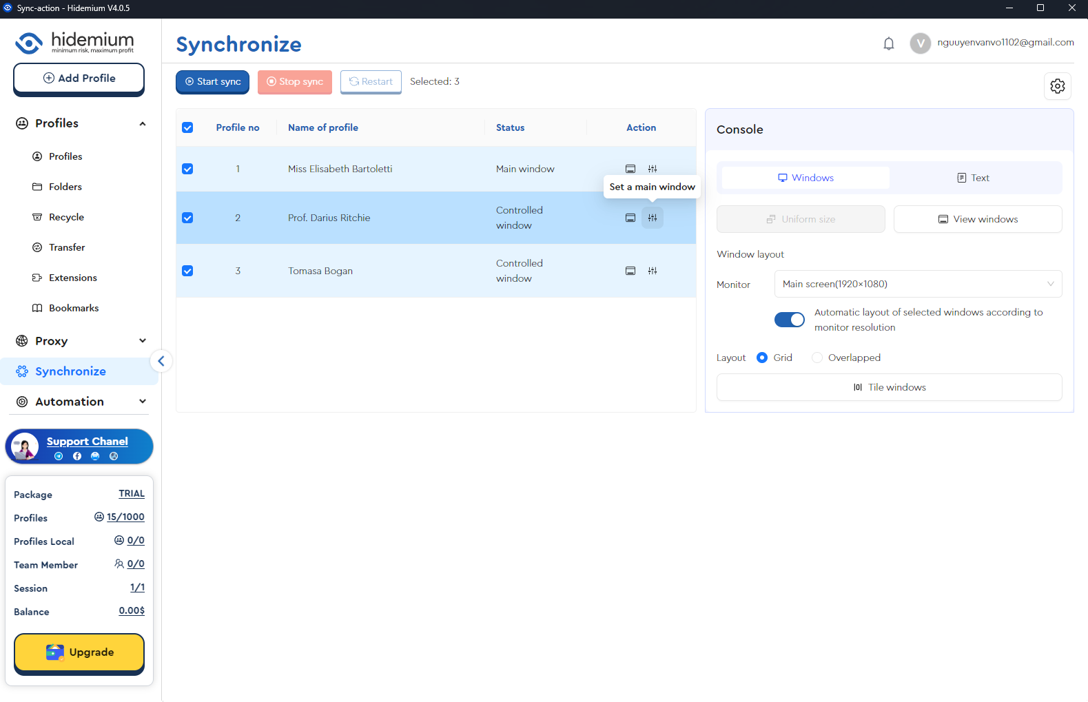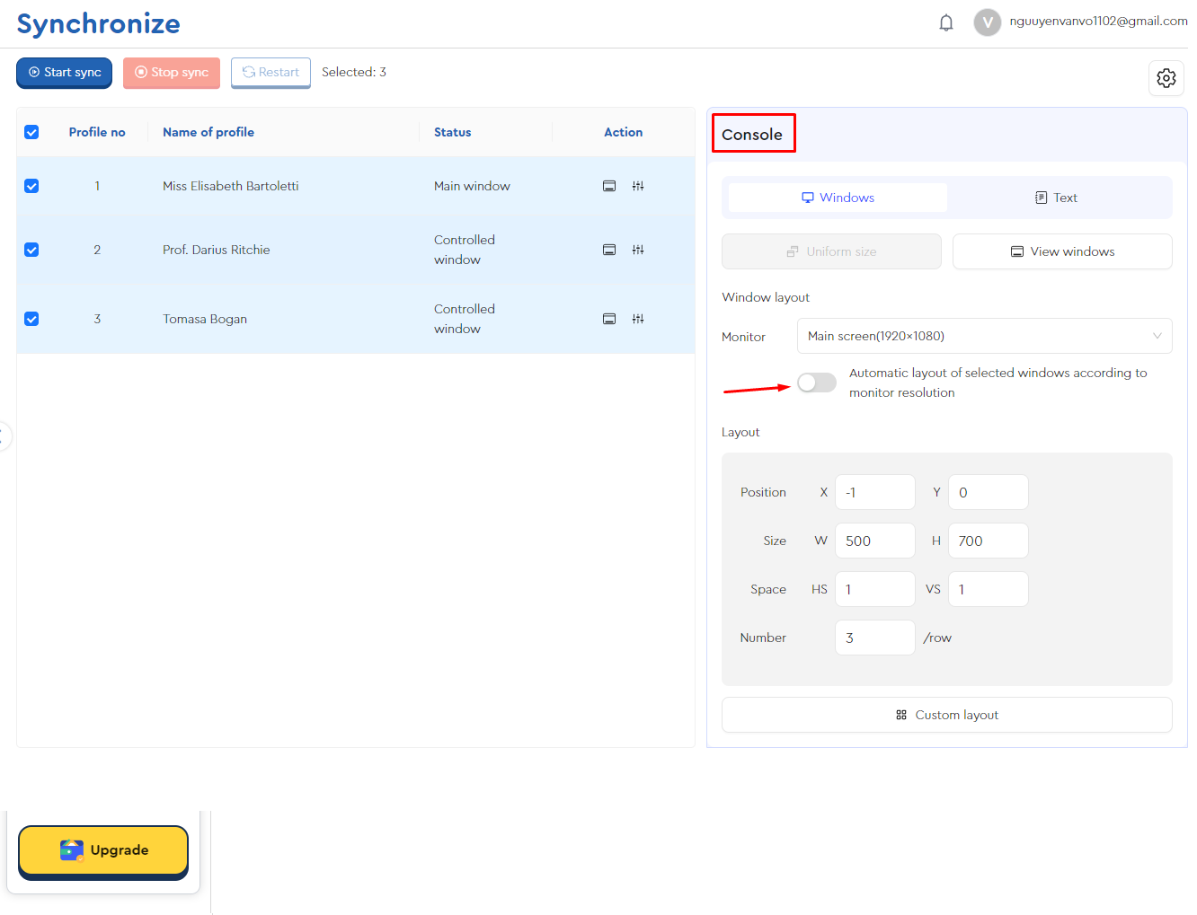 Trong mục Console của Synchronize, bạn có thể tự động điều chỉnh kích thước màn hình theo độ phân giải của monitor bằng cách chọn Automatic layout of selected windows according to monitor resolution. Nếu tích chọn, các Profiles sẽ tự động bố trí theo kích thước màn hình. Nếu không, bạn sẽ tự chọn bố cục phù hợp với công việc của mình.