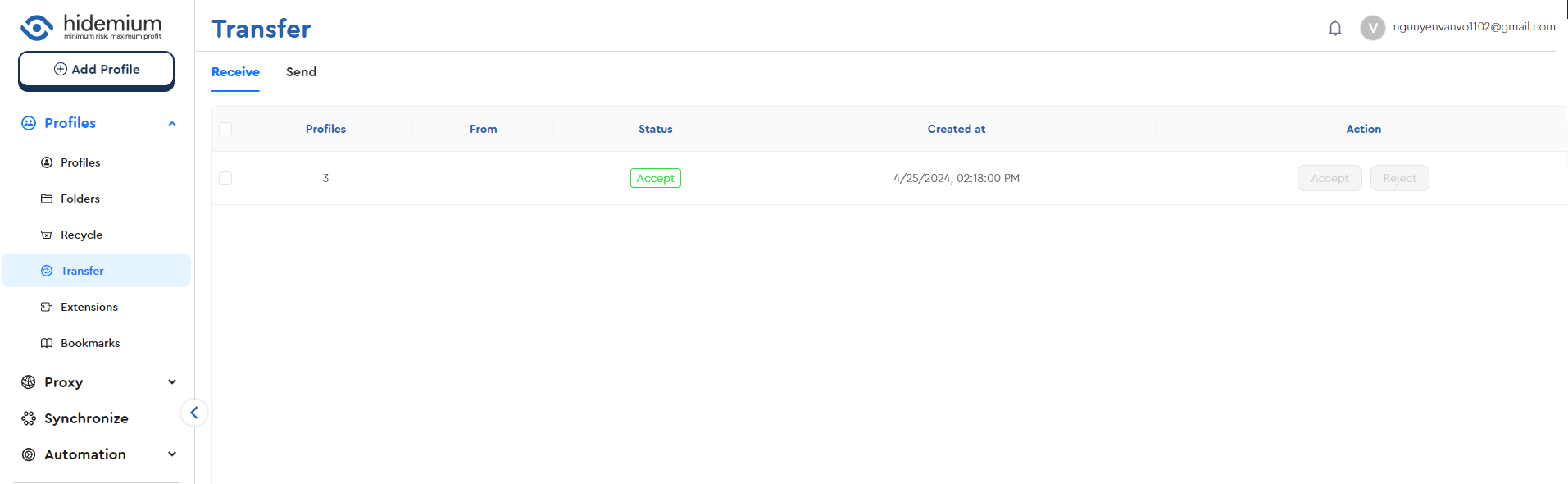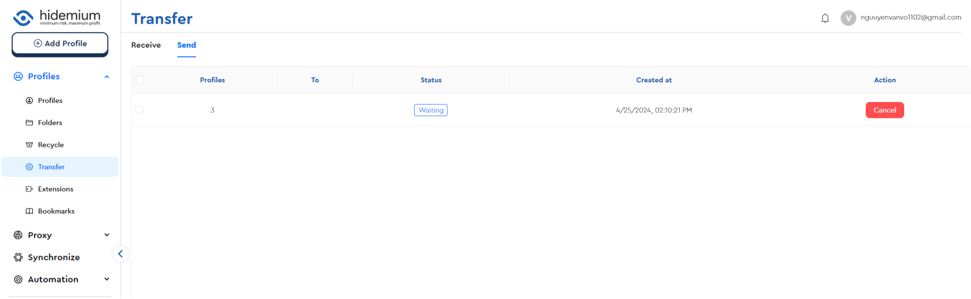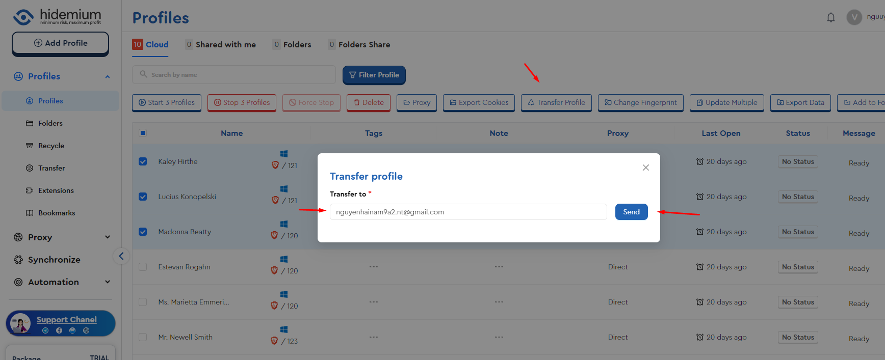 Trong bài viết này, chúng ta sẽ cùng tìm hiểu chi tiết cách Transfer Profiles trên Hidemium, giúp bạn dễ dàng quản lý và chia sẻ profiles với người khác. Transfer Profiles là một tính năng quan trọng giúp bạn gửi profiles cho các tài khoản khác qua email một cách nhanh chóng và an toàn.