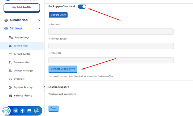 Bước 1: Tại màn Backup local, bật Backup profiles local, sau click vào button Connect Google Drive