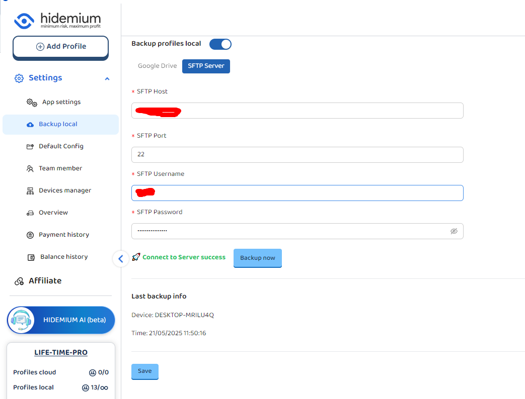Tại màn Backup local, bật Backup profiles local, sau đó bạn chọn SFTP server: