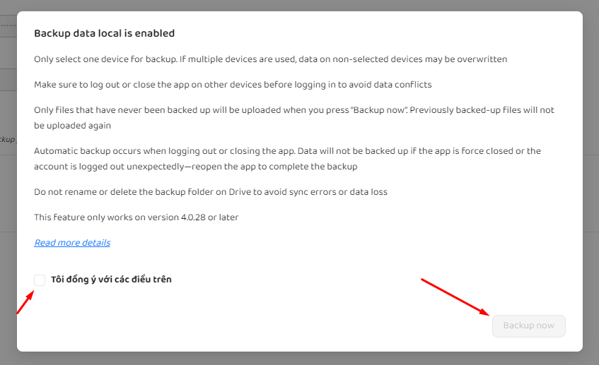 Bước 7: Sau đó bạn cần quay lại app, sẽ có 1 popup hiện lên, các bạn nhớ đọc kỹ nội dung trong popup. Sau đó tick chọn “tôi đồng ý với các điều trên” và sau đó click vào backup now.