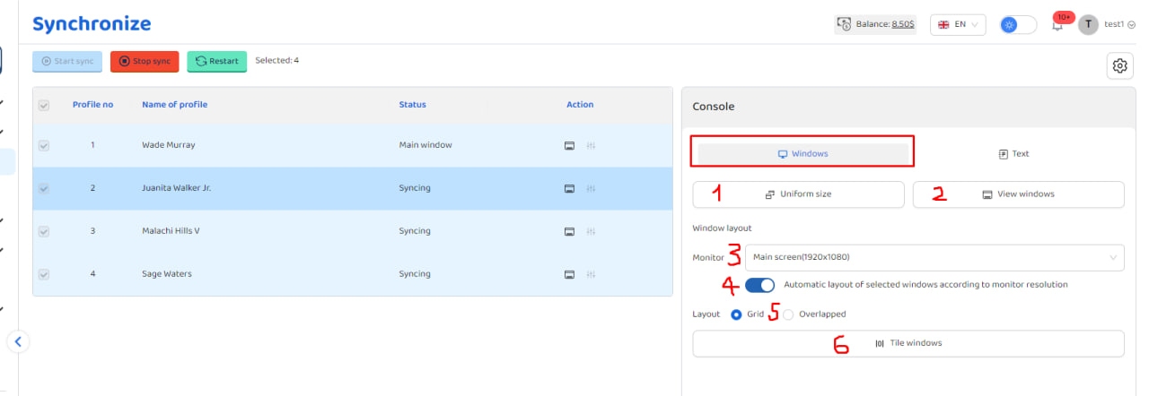 Bước 2: Sau đó chuyển sang màn Synchronize, chọn lại các profile đó và click vào Start (các bạn nhớ chờ cho đến khi các profile được mở lên hoàn toàn rồi mới được start sync nha)