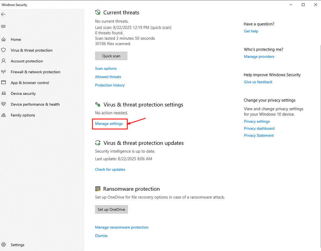 Bước 1: Trước khi tạo mới IPV6 vào virus & threat protecion settings -> chọn manager settings