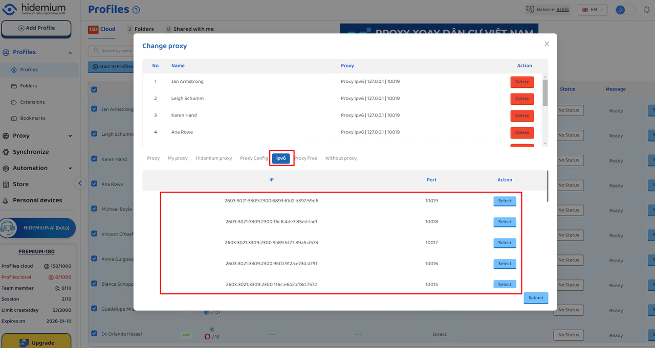 IP V6 Manager là giao diện cho phép người dùng tạo và quản lý địa chỉ IPv6 trên thiết bị, phục vụ cho việc chạy profile.