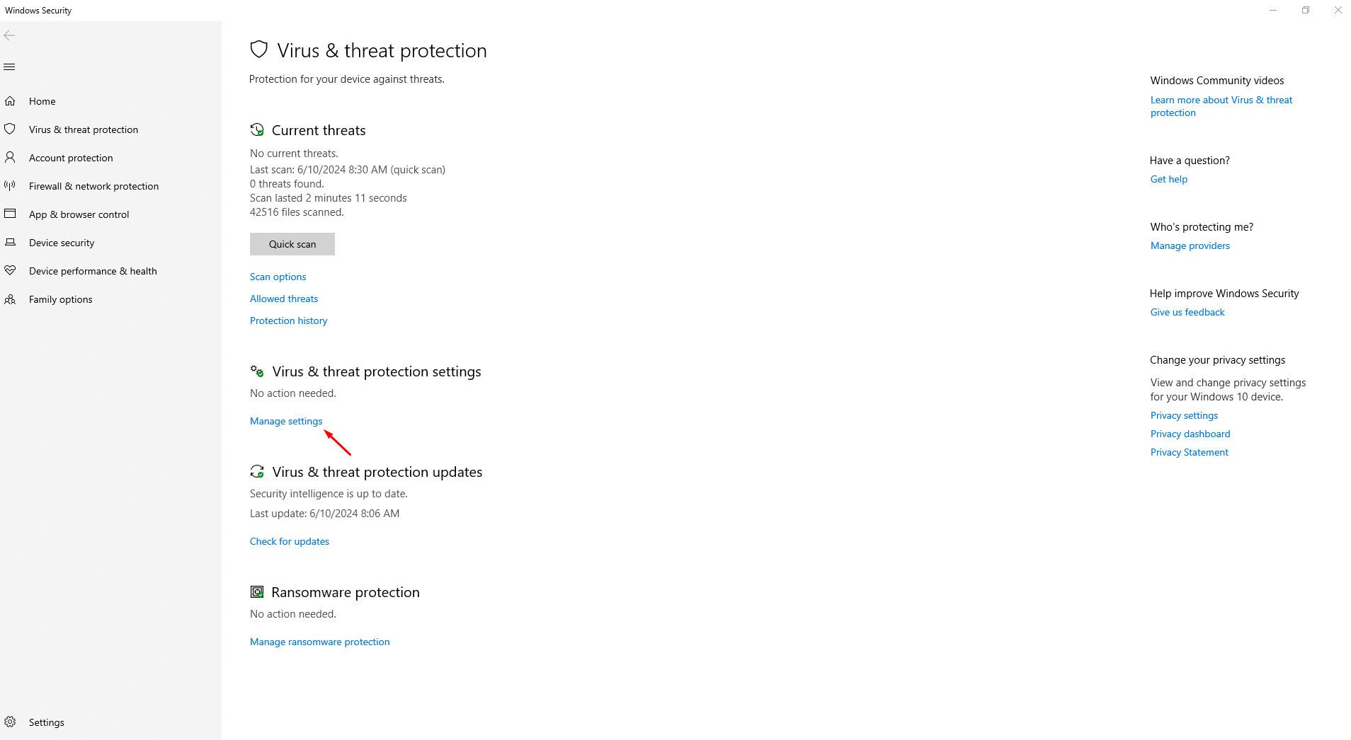 Trong mục: Virus & threat protection setting chọn Manage settings: