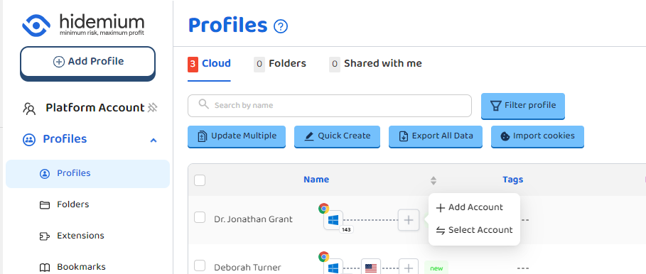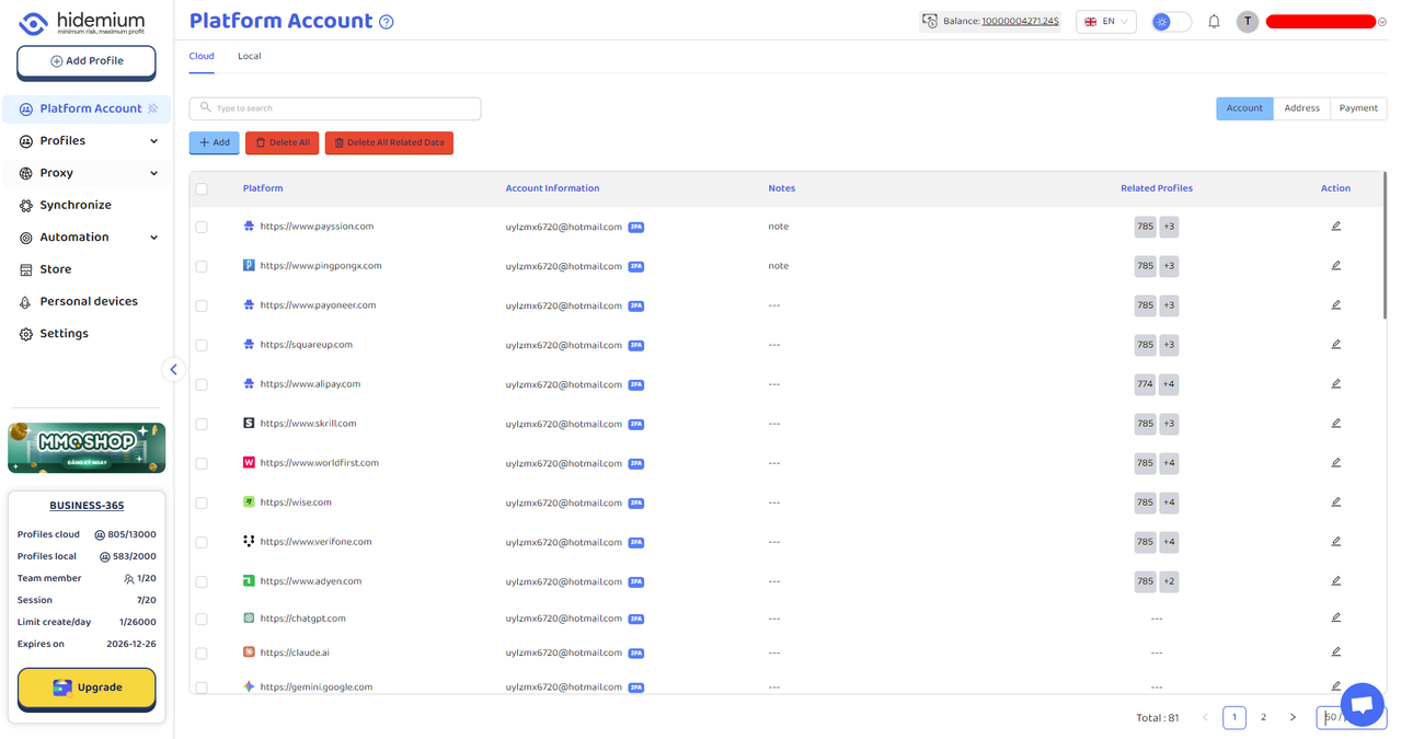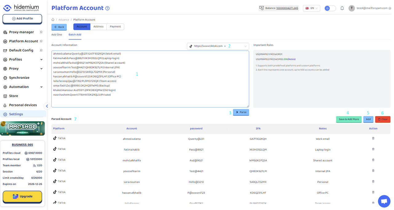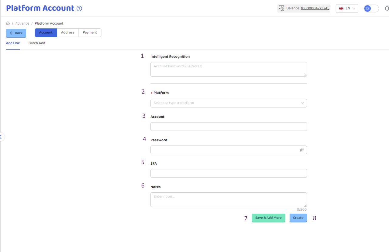 Chức năng tài khoản nền tảng của Hidemium cho phép người dùng thêm nhiều tài khoản từ các nền tảng khác nhau và nhanh chóng gán chúng cho hồ sơ (profile) được chỉ định nhằm nâng cao hiệu quả quản lý. Trên giao diện Account, nhấn nút “Add Account” ở góc trên bên phải để thêm tài khoản mới. Bạn có thể lưu các thông tin như: URL nền tảng (bắt buộc), tên đăng nhập, mật khẩu, mã 2FA và ghi chú. Màn Platform Account gồm các button: