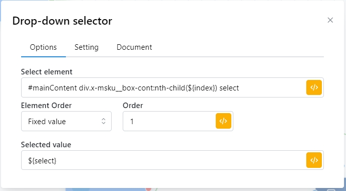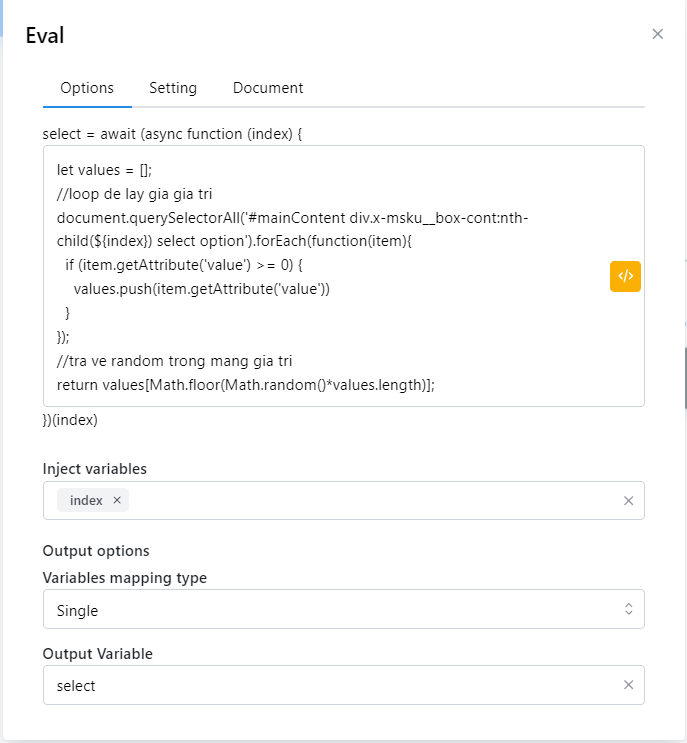 Node thứ 3 là EVAL, phần này những người đã biết code js thì có thể sẽ làm đơn giản hơn, còn với những người không biết như mình thì mình hay dùng chat gpt với pormt ” Give me js code……. ( nhập việc mà bạn muốn nó xử lý ) .. I will run in devtool”. Như ở đây mình hỏi chat GPT là đưa tôi đoạn code để lấy được tất cả các giá trị trong element … rồi chọn random một giá trị trong số đó. Ví dụ ở đây element #mainContent div.x-msku__box-cont là element chính ( bên trên có đề cập ) thì #mainContent div.x-msku__box-cont:nth-child(1) sẽ là box 1, #mainContent div.x-msku__box-cont:nth-child(2) sẽ là box 2, ký hiệu nth-child(index) chính là biểu thị element con, bạn có thể tìm hiểu về css thêm phần này nhé. vậy là chỉ cần thay đổi số 1 và 2 trong nth-child thì sẽ ra cái mình muốn, cho nên phần bên trong nth-child b để biến output của vòng for nhé. Cho nên phần eval code mới để ” #mainContent div.x-msku__box-cont:nth-child(${index}) select option ”