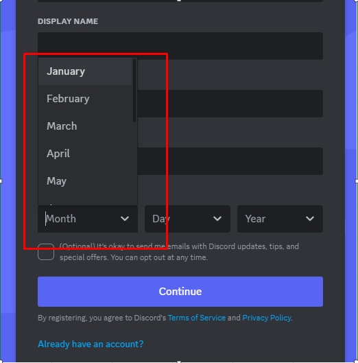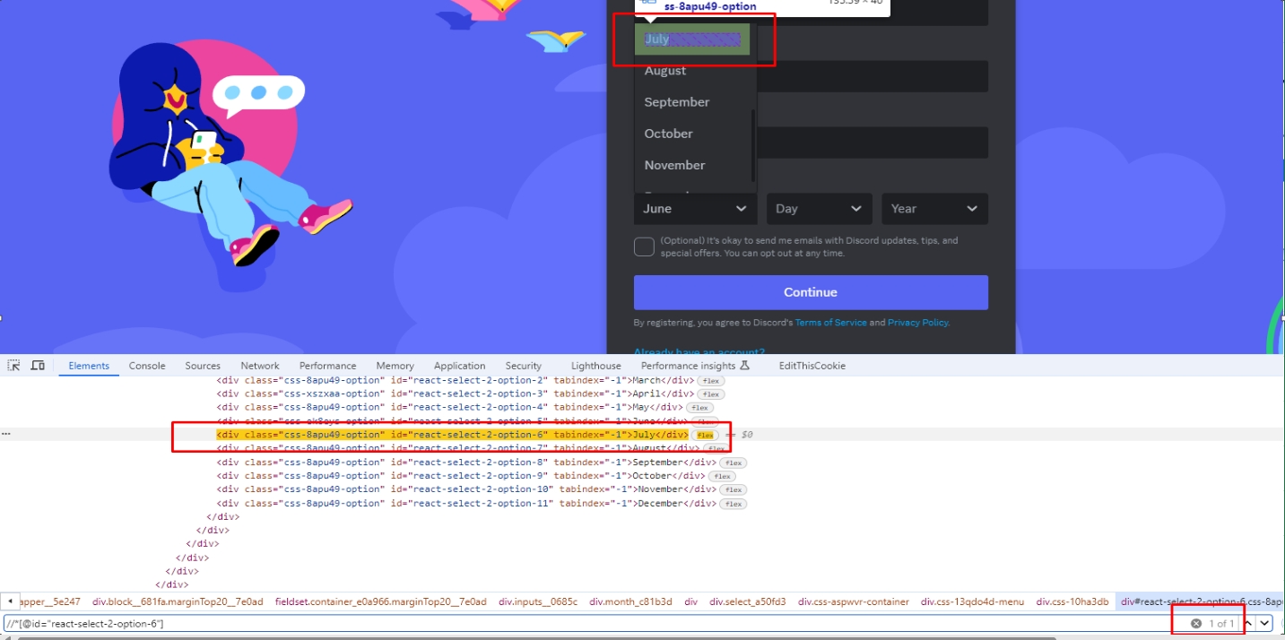 Nhìn vào bức ảnh trên ta có thể thấy đây đều là những button show option chọn dữ liệu đúng không ? Tưởng trừng như sẽ đều dùng chung 1 node để giải quyết vấn đề chọn các option được đưa ra như này, nhưng không, trong đây hoàn toàn là 2 trường hợp dùng node khác nhau, Hidemium sẽ hướng dẫn bạn phân biệt khi nào nên dùng node DROPDOWN SELECTOR và khi nào không nhé.1. Use case là discord– Bạn có thể thấy element chọn giá trị ngày tháng năm ở đây chỉ là những thẻ và thuộc tính bình thường, nên ở đây bạn dùng node CLICK như bình thường vào giá trị mà bạn muốn.Ví dụ chọn tháng 7 thì mình sẽ click vào element này.