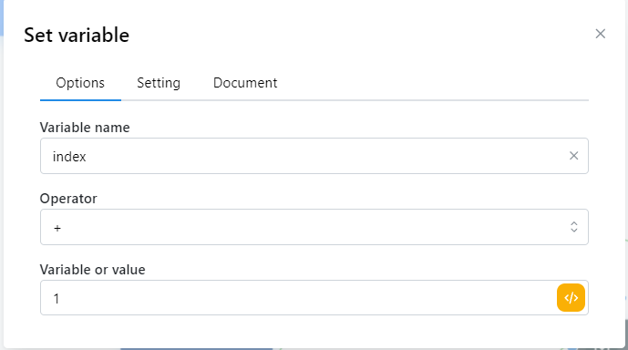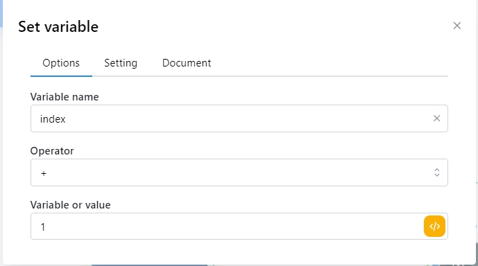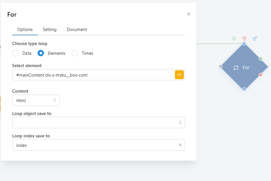 Sau đó cho vào vòng for, tạo biến output cho số lần lặp. Để mỗi lần tìm được element box ngoài này nó sẽ tự chạy quy trình chọn option bên trong. Giá trị của biến ” Loop index save to” là các số tự nhiên 1 2 3 đại diện cho số vòng lặp. đối với for element thì số thứ tự lặp lại bắt đầu từ 0 chứ không phải là 1 như lặp số lần, nên dùng thêm node SET VARIABLE +1 sau mỗi vòng để cho đúng số thứ tự nhé.