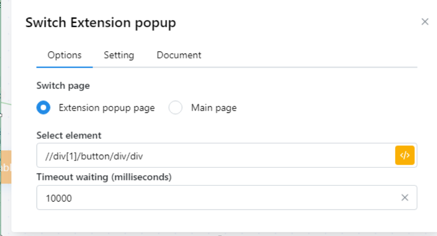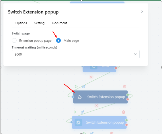 Còn trong trường hợp popup extension hiện ra khi không click vào đâu cả, bất ngờ hiện ra thì bạn sử dụng node SWITCH EXTENSION POPUP mà không cần nhập element nhé, chỉ cần điền timeout là được.