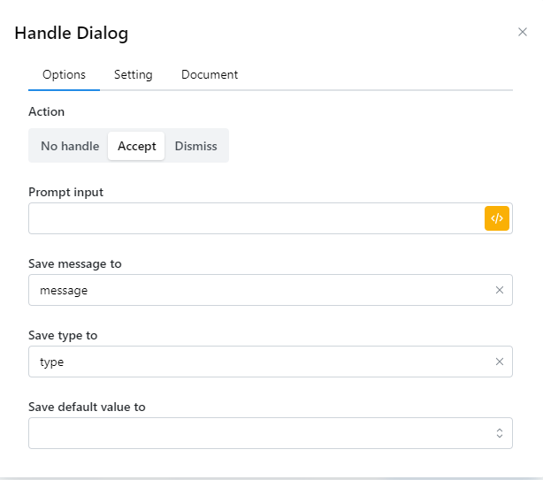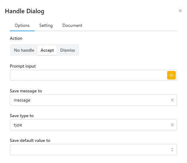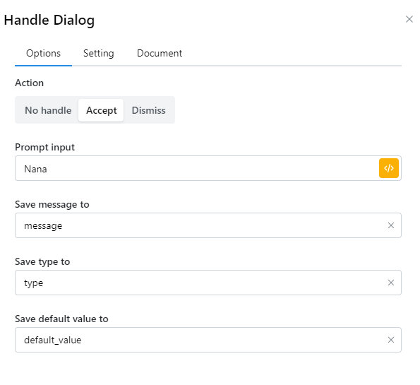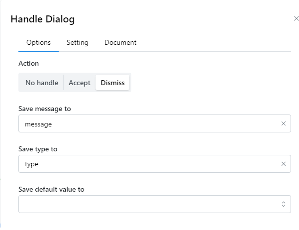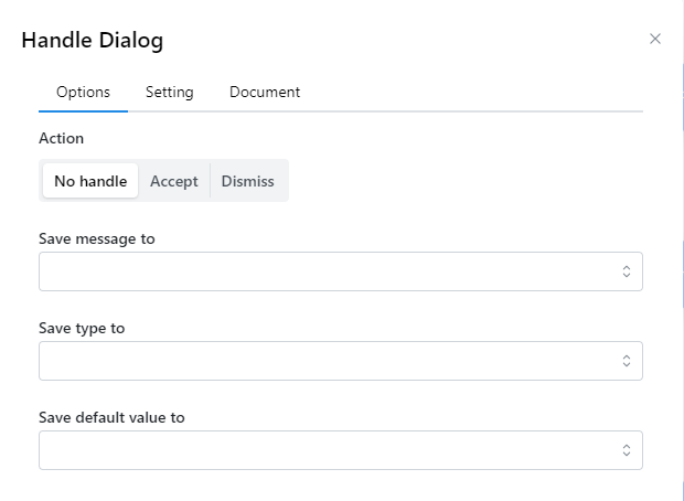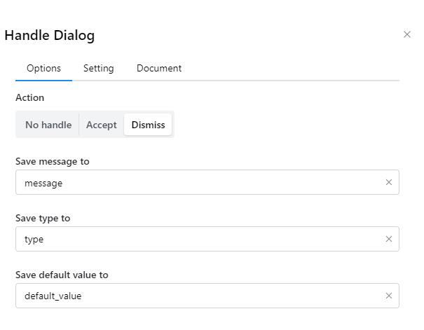 Khi Dialog hiện lên thì ta thường không thể thao tác được gì với trang web nếu không đóng Dialog. Khi đó ta cần sử dụng node Handle dialog để đóng hộp thoại được mở lên đó.