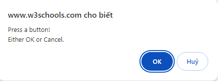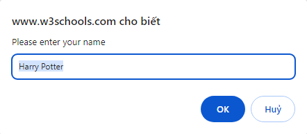 Prompt input: Trong Prompt Dialog thường sẽ hiển thị thêm một ô input để nhập dữ liệu. Khi bạn nhập vào trường Prompt input, giá trị mà bạn nhập vào sẽ được nhập vào ô input của dialog.