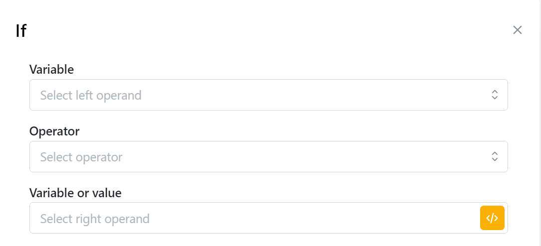 This node is used to test a condition, if the condition is true then the statement of the if block will be executed, otherwise it will be ignored. Nút này dùng để kiểm tra một điều kiện, nếu điều kiện đúng thì câu lệnh của khối if sẽ được thực thi và chạy ra đường màu xanh, nếu sai nó sẽ chạy qua đường màu đỏ.