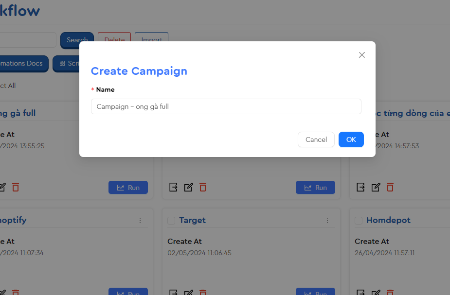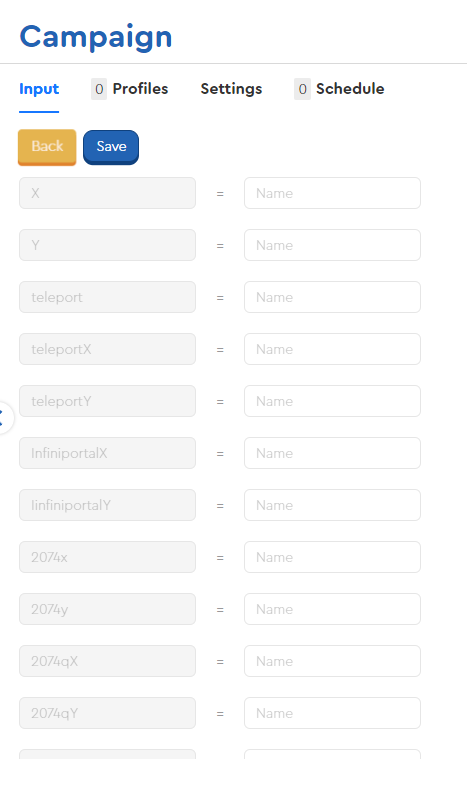 3. Input là phần để chỉnh các giá trị của biến trong script, cũ là mỗi lần chạy mà muốn thay các giá trị thì cần phải mở script ra rồi chỉnh thì giờ đây ta có thể chỉnh các giá trị của biến ngay tại màn “input” của tạo campgain này