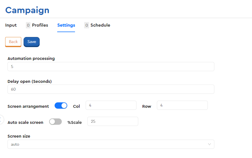 Screen size mới là phần resize profile to nhỏ nếu bạn muốn các profile chạy với size màn giống nhau. Lưu ý là chỉ có thể nhập size nhỏ hơn size profile mặc định nhé.