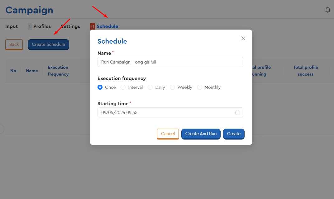 6. Schedule là phần setup lịch chạy của campaign, bạn có thể chọn chạy ngay lập tức nếu click vào option ONCE => Create And Run. Hoặc chạy lặp lại nhiều lần theo thời gian hoặc theo ngày, theo tuần, theo tháng. Phần này bạn có thể đọc kĩ hơn tại https://docs.hidemium.io/automation-user-manual/how-to-start-script-auto#ii.-cac-cach-co-the-run-script-auto-voi-cac-profile mục II. Các cách có thể run script auto với các profiles.