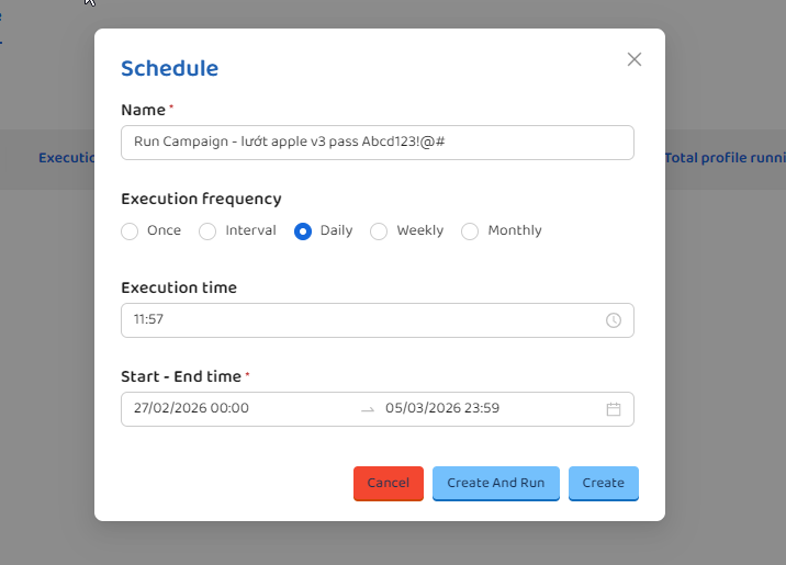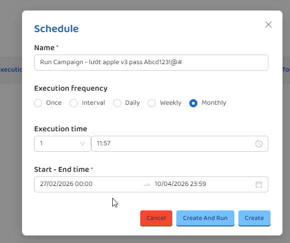 Sau khi setting schedule xong thì bạn click chọn create and run để chạy luôn ( khi đến giờ chạy).