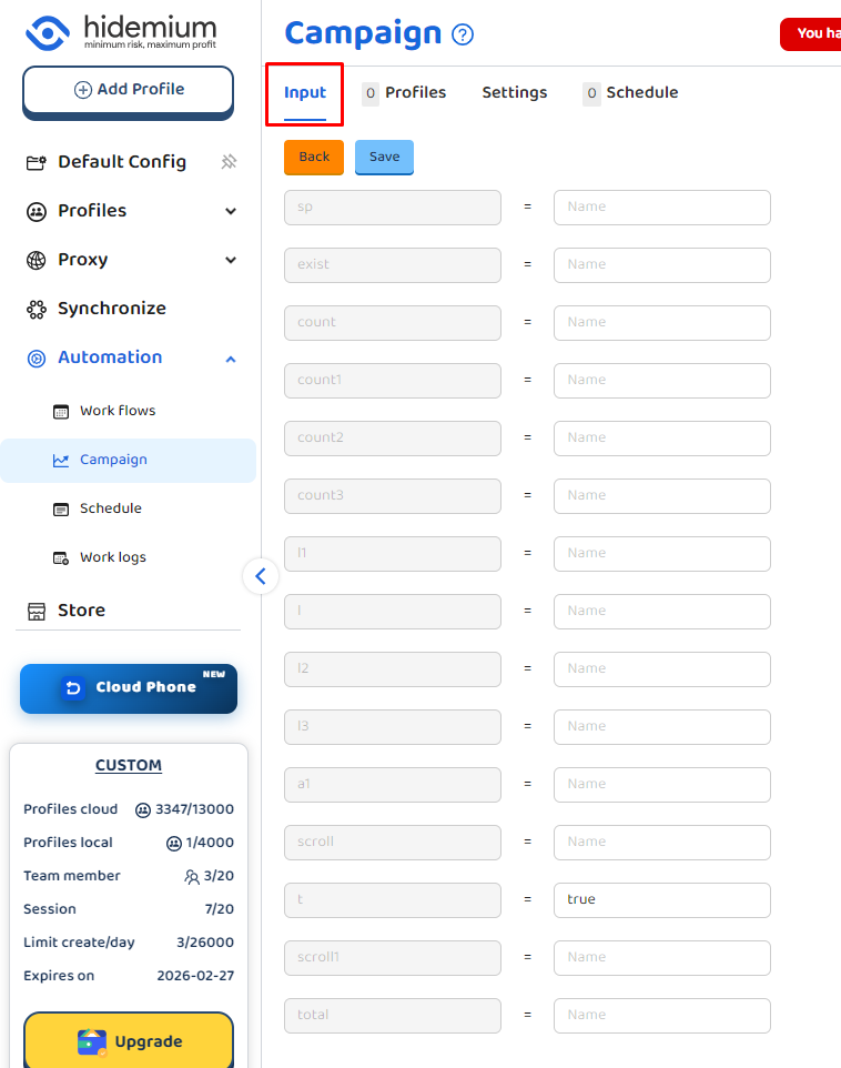 Input: Đây là phần để chỉnh các giá trị của biến trong script, cũ là mỗi lần chạy mà muốn thay các giá trị thì cần phải mở script ra rồi chỉnh thì giờ đây ta có thể chỉnh các giá trị của biến ngay tại màn “input” của tạo campgain này.