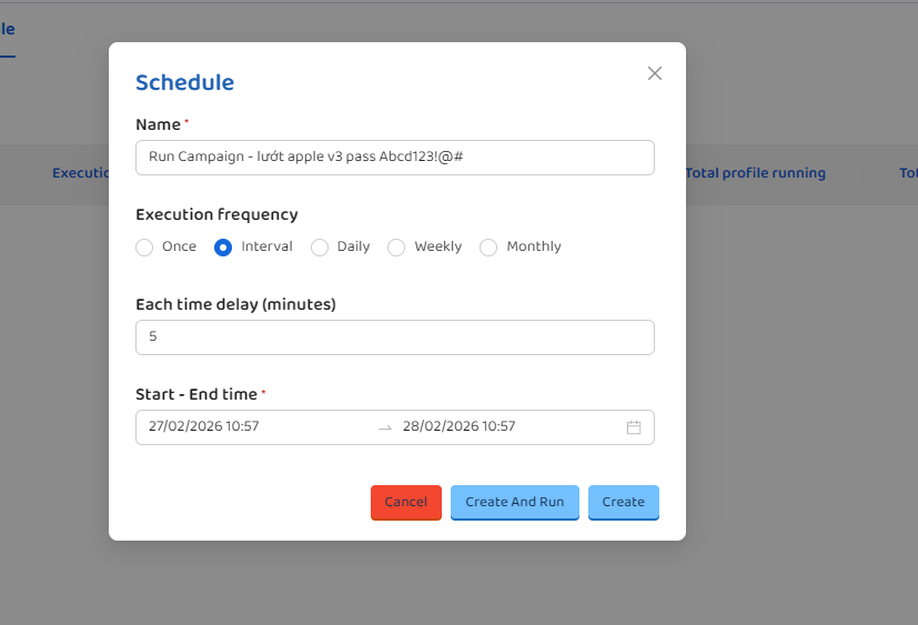 Interval: Chạy trong khoảng thời gian từ start time đến end time. Bạn cần nhập Each time delay, trường này bạn cần nhập khoảng thời gian delay giữa các lần chạy. Ví dụ bạn nhập là 5 thì khi chạy xong một lần 5 phút sau mới chạy lần thứ 2, cứ thế cho đến hết end time.
