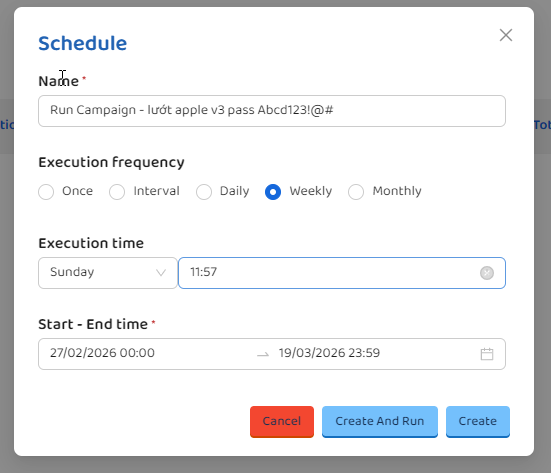 Weekly: Chạy hàng tuần. Tại Execution time bạn có thể chọn thứ để chạy và giờ chạy. Và chọn thời gian bắt đầu và thời gian kết thúc.