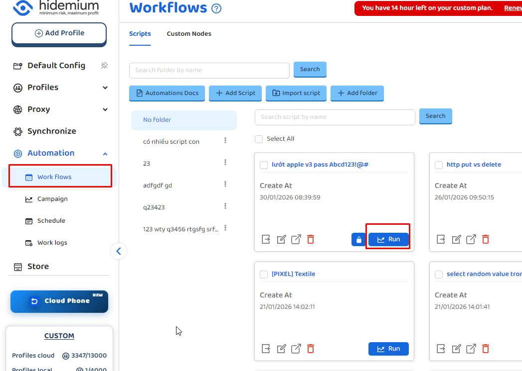 Tại màn workflows -> chọn script mà bạn muốn chạy -> chọn run. khi popup mở lên bạn nhập tên camp và ấn submit.
