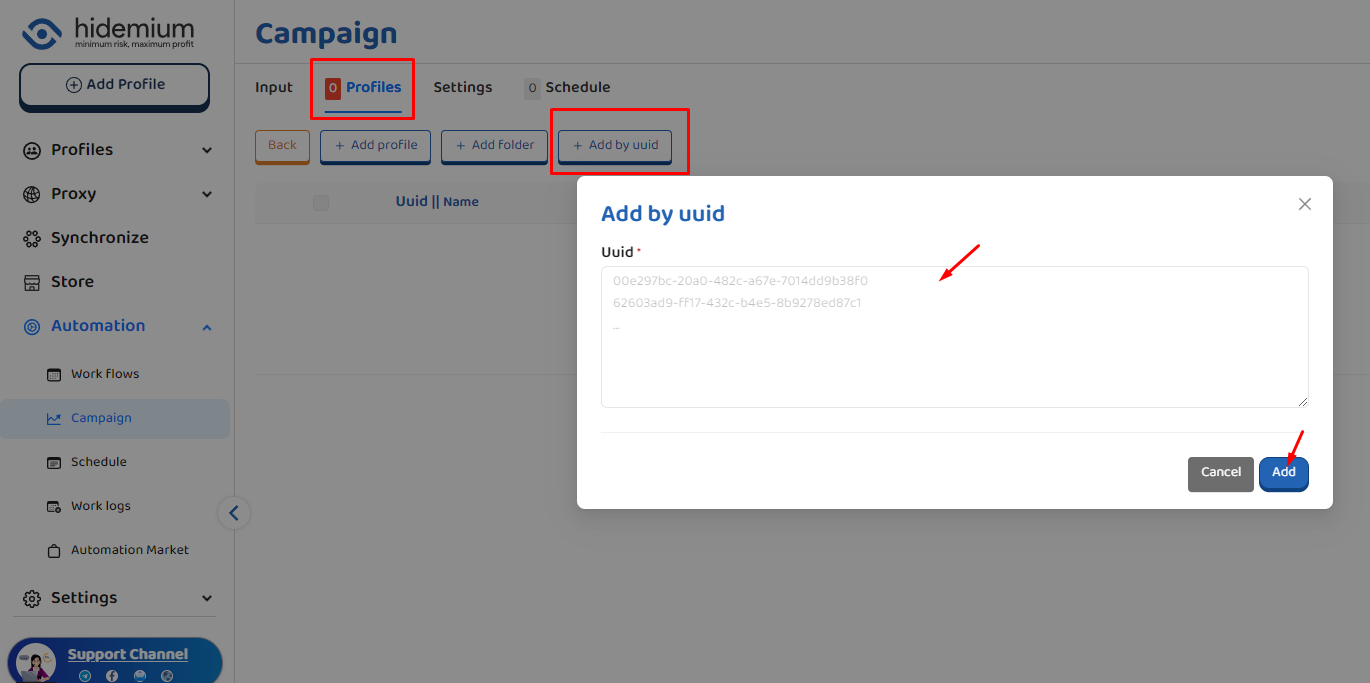 Ở màn profiles, bạn có thể chọn add profile theo uuid, mỗi dòng là một uuid.