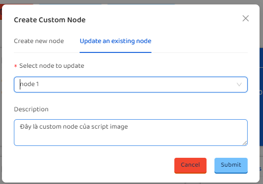 Bước 2: Khi popup hiện ra, bạn chọn tab Update an existing node, sau đó bạn chọn một custom node mà bạn muốn update script vào. Tại đây bạn cũng có thể sửa lại mô tả của custom node.
