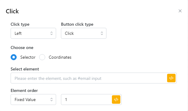 <table><thead><tr><th width="258">参数</th><th>说明</th></tr></thead><tbody><tr><td>Click type</td><td><p>左键：在所选元素上单击鼠标左键 </p><p>右键：在所选元素上单击鼠标右键 </p><p>中建：在所选元素上单击鼠标并在新标签页中打开。 </p><p>向下单击：单击鼠标并同时按住鼠标按钮。 </p><p>向上单击：在所选元素上释放鼠标按钮。</p></td></tr><tr><td>Button click type</td><td><p>单击：在所选元素上单击一次 </p><p>双击：在所选元素上双击鼠标</p></td></tr><tr><td>Selector</td><td>输入要点击的元素的 CSS 选择器。</td></tr><tr><td>Element order </td><td>"选择网站的哪个元素： 固定值：选择一个固定元素 随机值：在设定的范围内随机选择一个随机值"</td></tr><tr><td>Coordinates</td><td>输入要点击的元素的 x,y 坐标</td></tr></tbody></table>