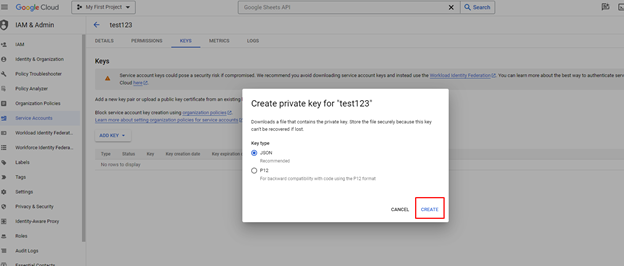 创建后，JSON 文件将自动下载，并将该文件添加到 Spreadsheet V2 节点的Credencial字段中。