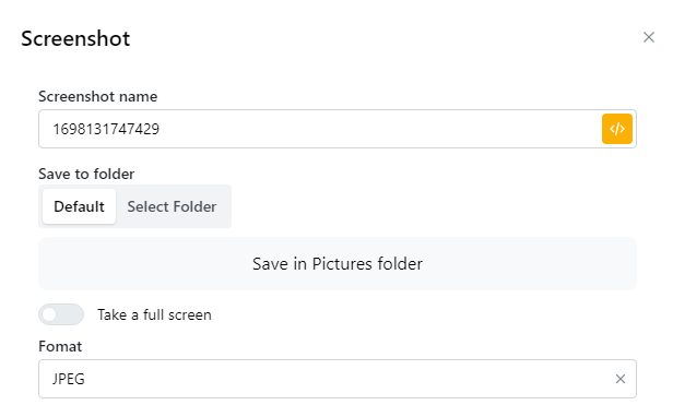<table><thead><tr><th width="239">参数</th><th>说明</th></tr></thead><tbody><tr><td>Screenshot name</td><td>您可以输入您想要的图片名称或者使用node的默认名称。</td></tr><tr><td>Save to folder: Default</td><td>自动将照片保存到设备的图片文件夹。</td></tr><tr><td>Save to folder: Select Folder</td><td>选择保存照片的地方。</td></tr><tr><td>Take a full screen</td><td><p>开启：截取整个网页</p><p>关闭：截取网站屏幕上当前显示的部分</p></td></tr><tr><td>Format</td><td>选择导出图像格式为 png 或 jpeg。</td></tr></tbody></table>